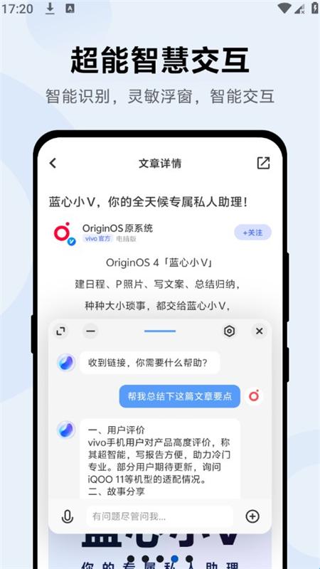 4、超能智慧交互:通过智能识别技术,实现灵敏浮窗和智能交互,提高用户使用体验,使交互更加便捷。