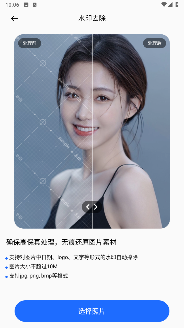2、水印去除:以后可以根据自己的需求快速的去处照片水印,让你拥有无水印的图片素材。