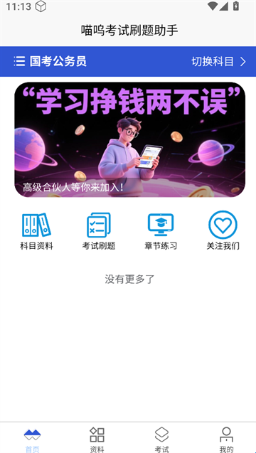 3、首页可以进行查看资料、考试刷题、章节练习等,上栏可切换科目。
