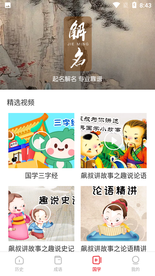 历史国学大全软件是一款免费的国学经典app。平台内为广大小伙伴们提供了海量国学知识内容,不管是孩子还是家长日常翻阅、学习都是非常不错的,质量高来源广数量多,各种视频介绍带你切身实地体验,非常好用,有需要的小伙伴们快来下载体验吧!