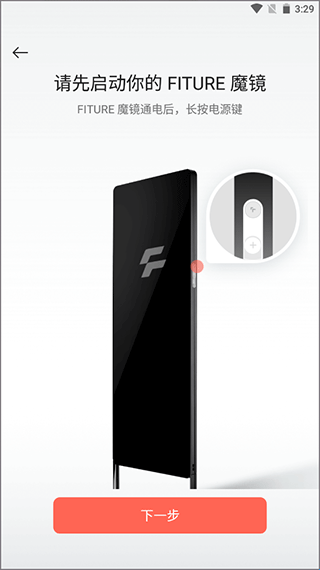 3、然后让魔镜处于通电状态并长按电源键,点击下一步。