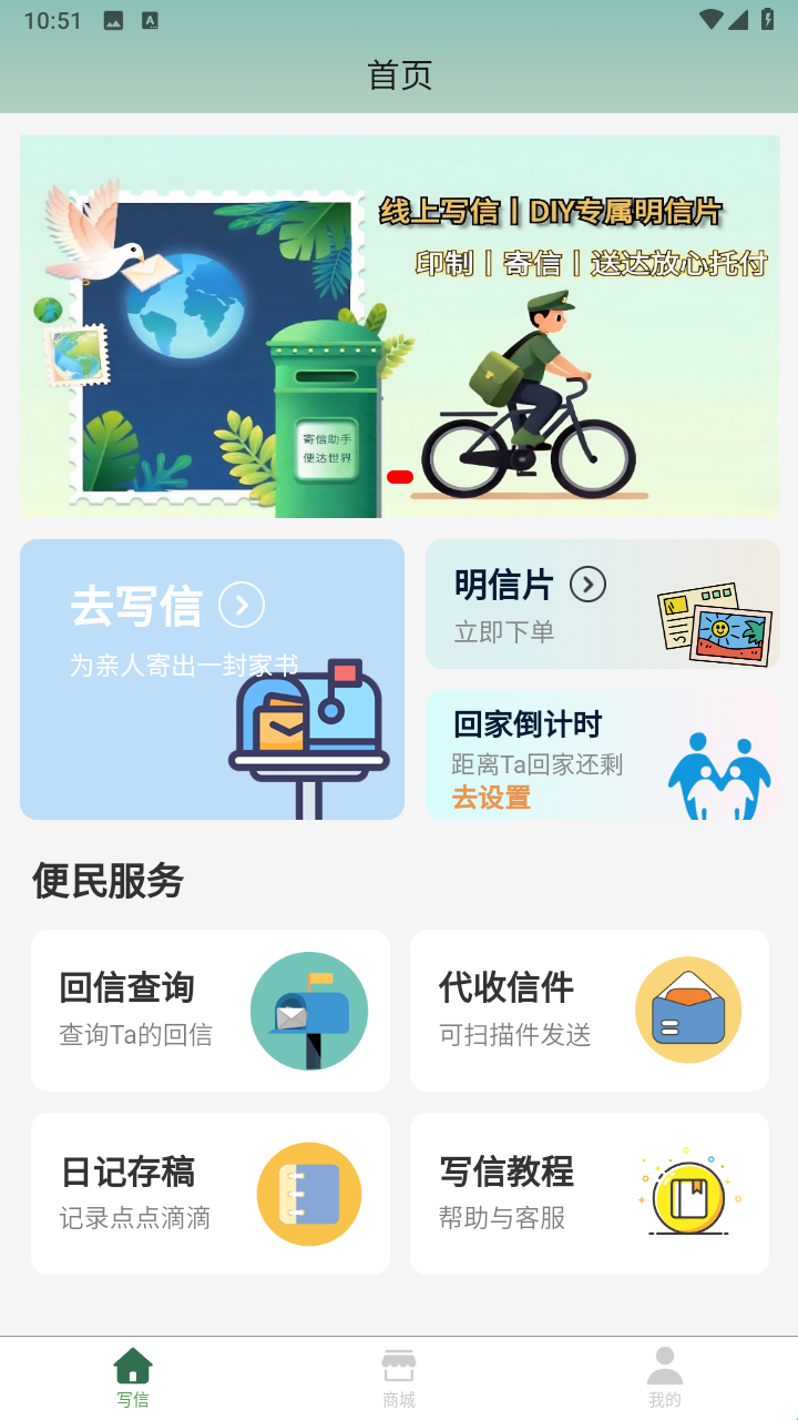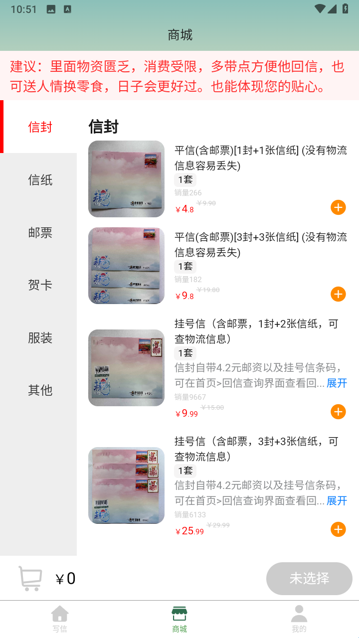 1、信件商城:还提供在线的商城信息,在这里可以获取信封、信纸、贺卡、服装等,可以快速选择。