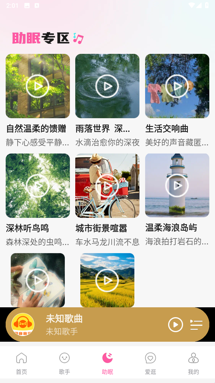 3、在助眠页面,则为大家展示了丰富的白噪音素材,可以睡前倾听。