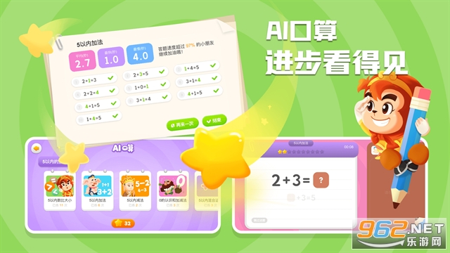 悟空数学是一款为儿童打造的数学思维逻辑启蒙应用,它依据儿童的认知心理特点进行设计,旨在激发孩子们的兴趣和潜能,在数与量、计算、空间与图形、逻辑推理、时间等核心领域中综合培养他们的逻辑思维。