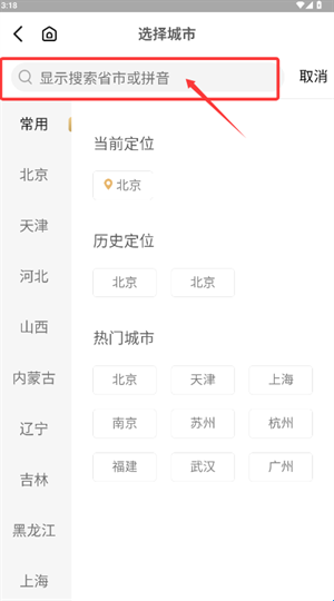 1、启动应用后,在城市选择页通过搜索或拼音输入定位意向城市。