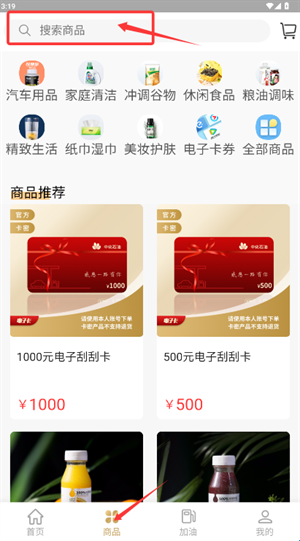 2、切换至商品页,在搜索栏键入名称以查找所需购买的具体物品。