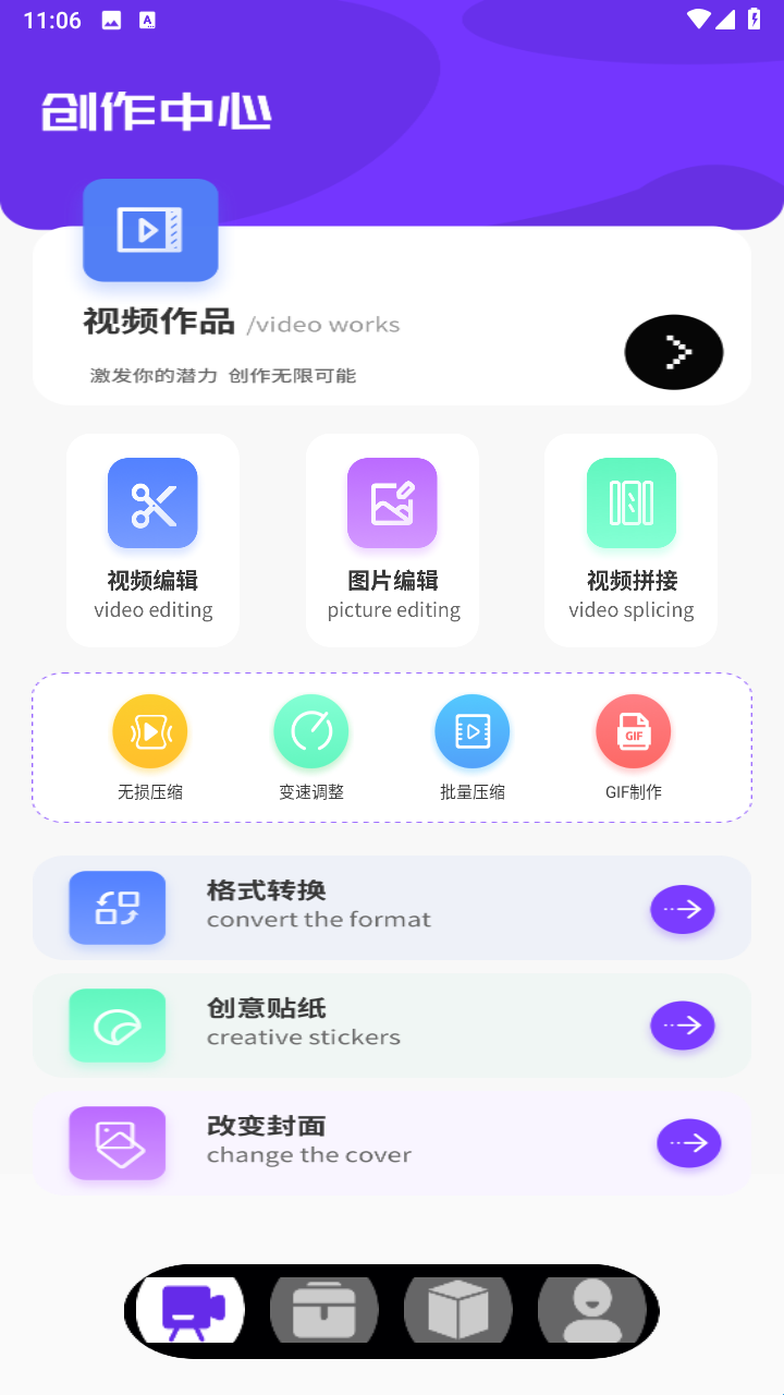 2、包含视频剪辑、图片编辑、视频拼接、无损压缩、变速调整、批量压缩、创意贴纸等工具。