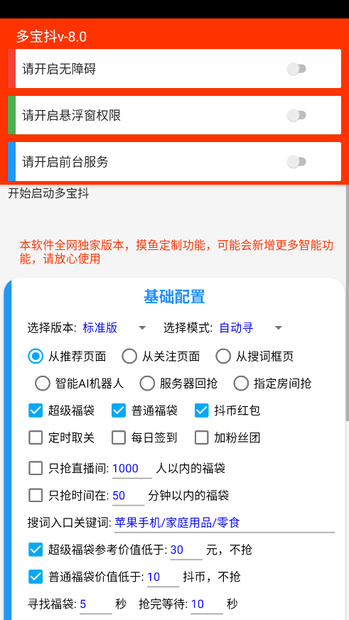 2、自动秒抢:在指定时间内自动开启和秒抢红包和福袋。