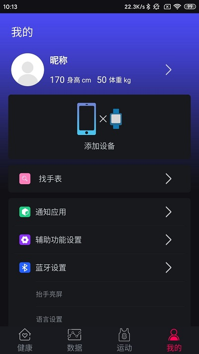 4、设置页面提供智能设备添加入口,支持连接手环等外部运动监测设备。