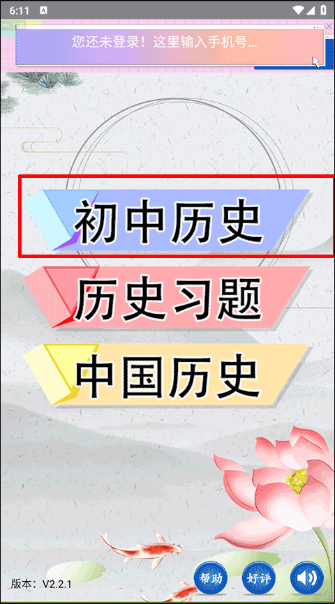 1、首先,打开初中历史app,在标题界面可以点击初中历史、历史习题、中国历史来针对性的学习历史;