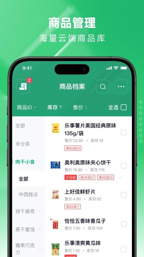 3、商品管理:百万云库商品资料,资料录入更便捷,还有大小包装自由转换、智能补货功能,让商品管理更轻松。