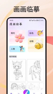 1、主题临摹库提供丰富模板,涵盖简约、彩色、动物、人物等多种风格,新手可轻松上手,跟着画提升绘画手感。