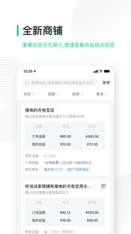 为公司客户(代理商、加盟商)对设备(移动电源,简称“设备”)进行综合管理,设备也可以分配给下级商家,设备管理更简单方便,支持全国各地,并拥有租赁订单、收益板块等功能性服务,是竹芒合伙人的好帮手。