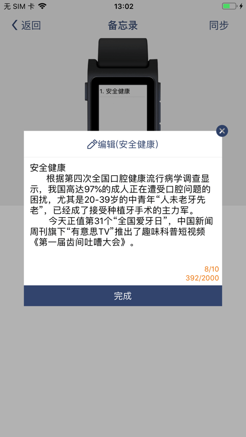 5.强大的备忘录功能:用户可以在软件中填写重要的备忘录信息,通过app推送到腕表上,避免遗忘。