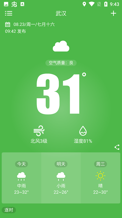 1、详情显示当天天气情况与温度,点击箭头切换到具体的天气信息;