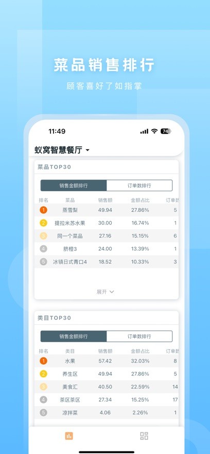 5、销售报表:多维度统计菜品销售情况,热销菜品一目了然。