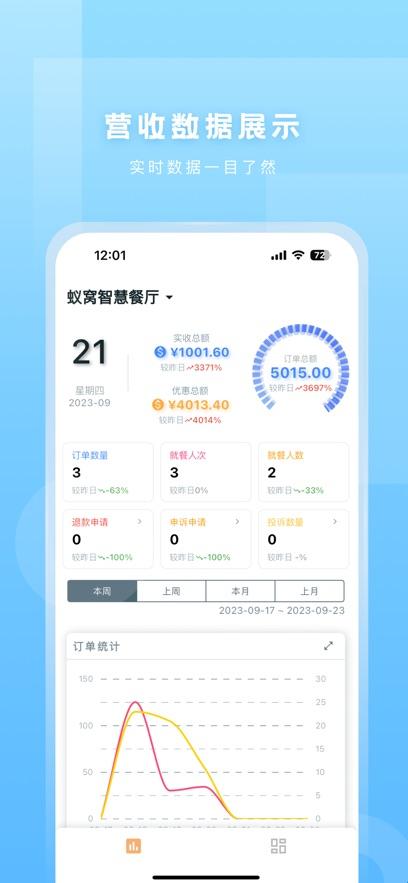 1、营收展示:精准统计餐厅当日营收数据,一键查看餐厅往期营收状况。