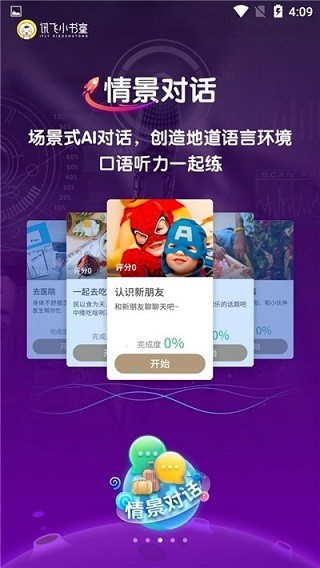 3、说的部分“情景对话”,模拟生活日常交流场景,从认识新朋友、到吃饭、娱乐、购物、由浅入深地引导孩子开口说。用户可以和机器进行自由对话,系统会智能识别分析对话内容进行反馈。