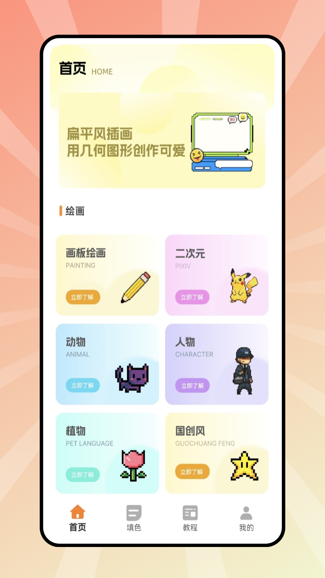 1、界面简洁直观,底部导航栏清晰划分“首页”“填色”“教程”“我的”,快速切换功能。