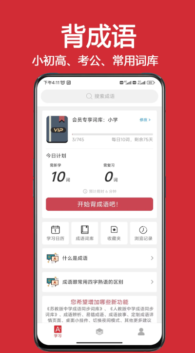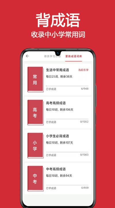 2.语文同步学-成语斩,可选择小学.中考.高考.生活常用词库,自由制定每日学习计划学新成语,复习已学成语,保持词汇量不断增长。