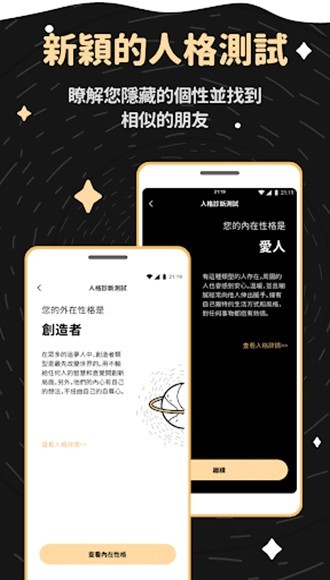 1、该应用程序不关心社会地位或外表。放松,释放你的情绪。您还可以与其他有趣的明星建立联系。不同的明星相互吸引,分享温暖的力量。