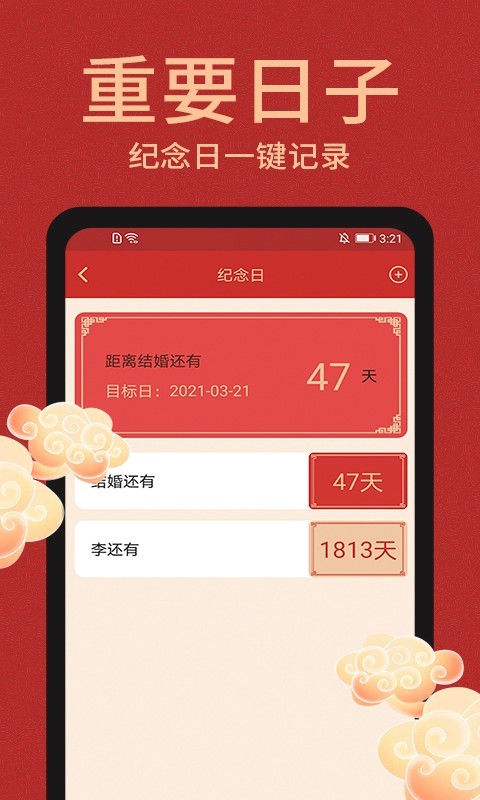 3、日程管理:贴心日程管家,您可以自定义纪念日,生日,计算倒数日,添加待办事项,任务清单,设定提醒闹钟与闹铃铃声,不错过每一件重要的小事与每一个有意义的日子