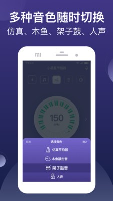 提供多种音色供选择,如仿真节拍器.木鱼敲击音.架子鼓音和人声等,可选择不同音色来满足不同情况的需要;