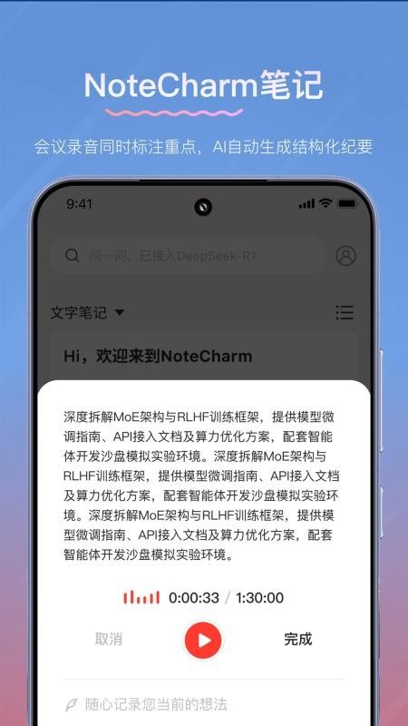 NoteCharm可以帮助用户提升自己的职场工作效率,利用笔记本可以轻松记录下所有的灵感以及工作信息,并且可以运用智能AI技术将所有笔记转化为条理清晰的精简笔记,查阅笔记内容更加的轻松快捷;运用智能AI笔记可以得到全新的笔记记录体验,享受智能的笔记记录服务。