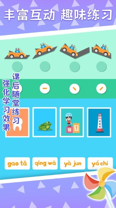 巧多拼音是一看为儿童打造的一款学习拼音的学习软件,里面拥有许多创意性的拼音学习动画、小游戏等等资源,帮助孩子在趣味中学习拼音。跟读软件正确的发音,通过看、听、说多感官的练习,可以使得拼音记得更加牢固,软件里面都是拼音最基础的知识比较简单,家长和小朋友可以一起学习,亲自互动。