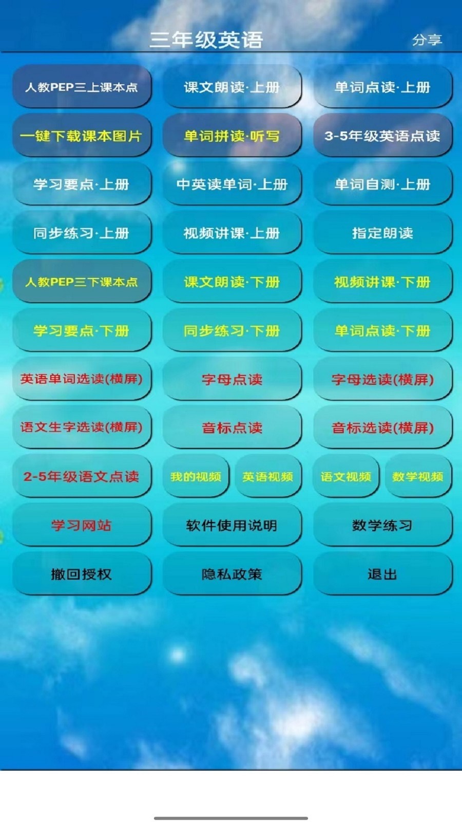 1、小学三年级上册英语(下册)课文点读、翻译、单词朗读等。