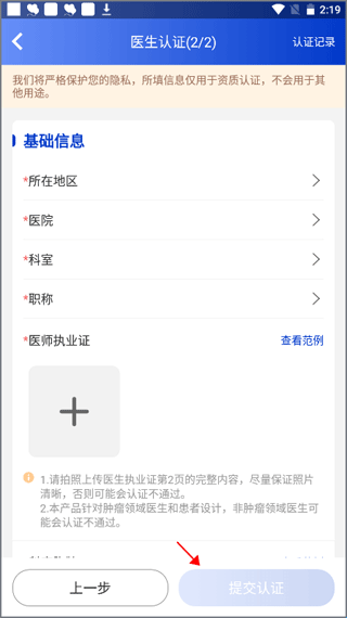 4、填写自己的医院信息,上传自己的医师执业证书,将表填写完后点击“提交认证”,等待审核通过就表示入驻成功了。
