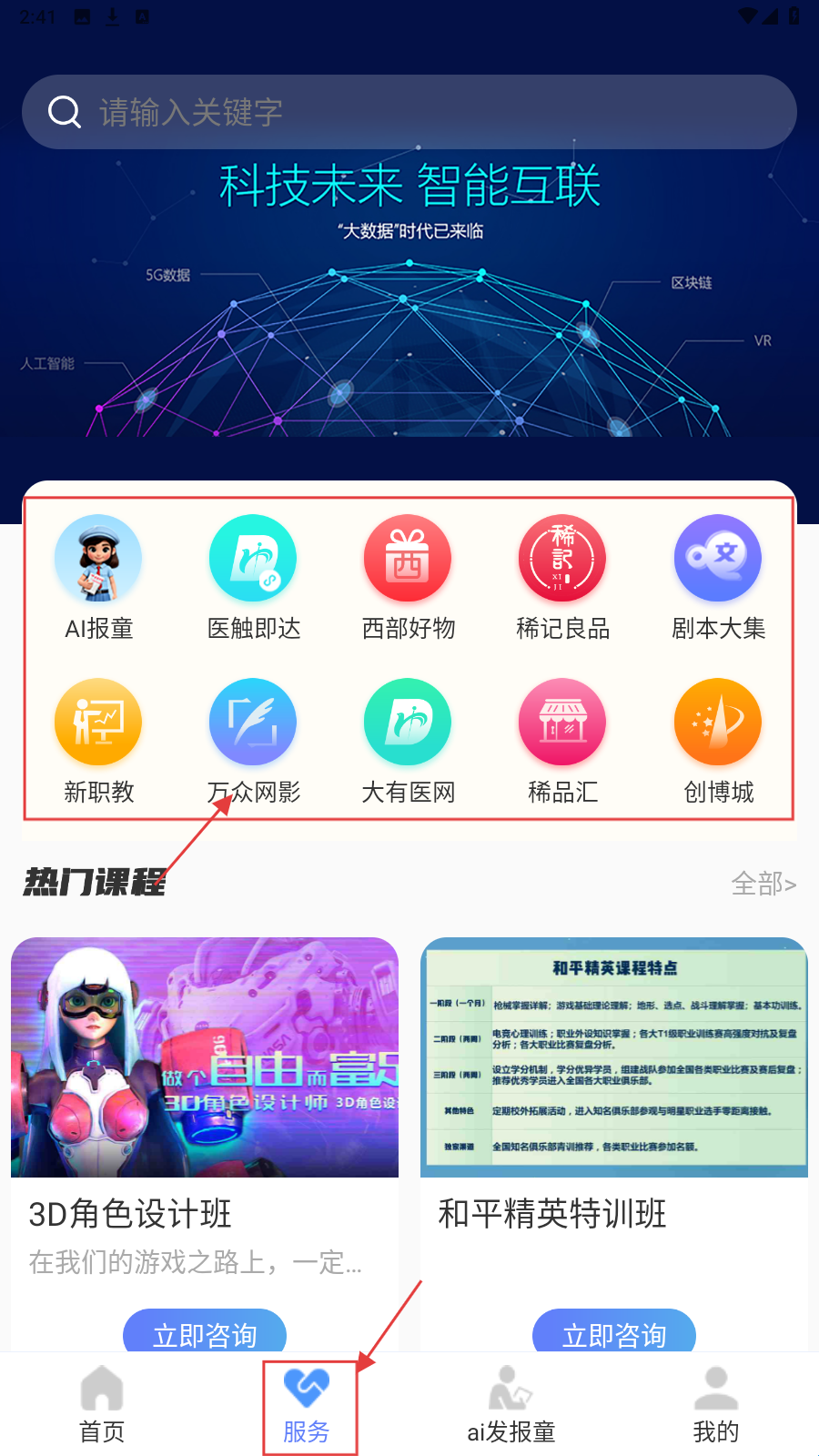 2、点击底部【服务】进入服务页,有【AI报童】【医触即达】等功能入口。