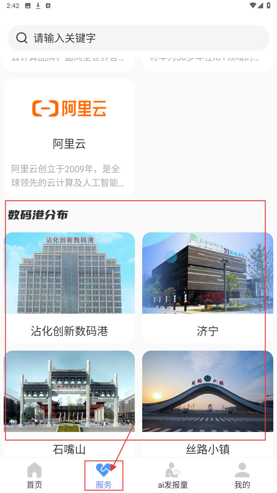 3、在服务页往下滑动,还能看到【阿里云】介绍及【数码港分布】板块,包含【沾化创新数码港】【济宁】等数码港信息。