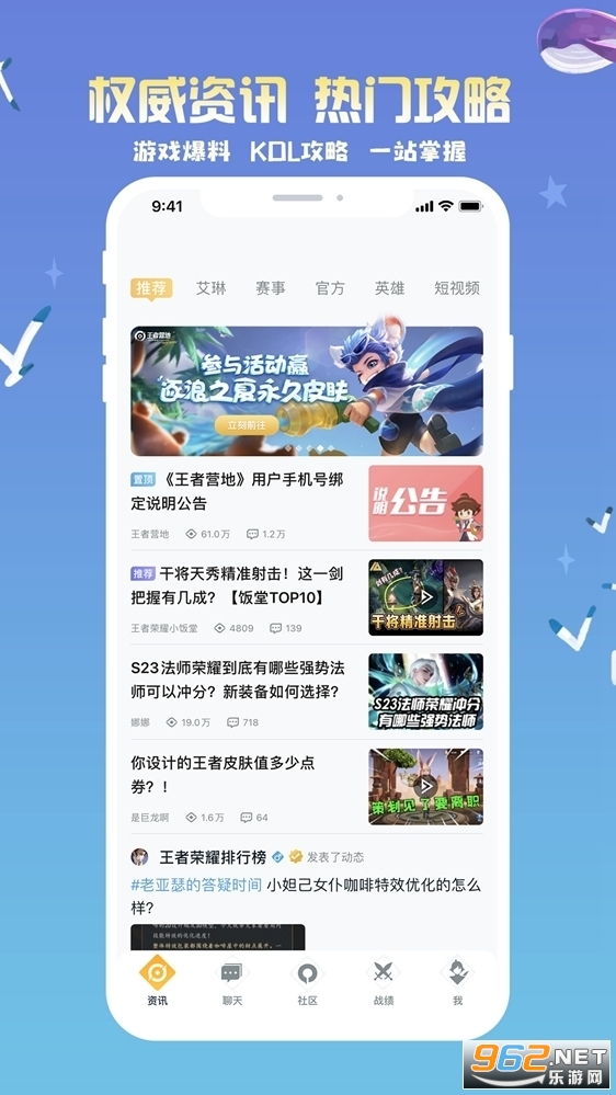 了解官方最新资讯、看直播、找攻略、参与活动,发现王者新鲜事;