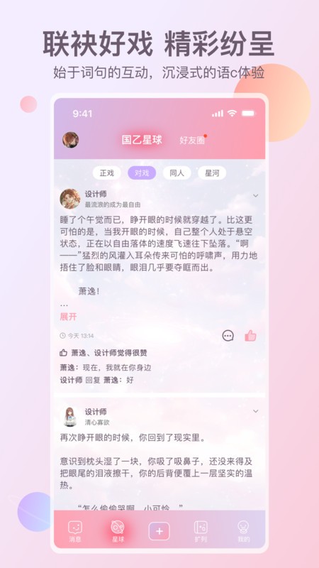 次元星app官方免费正版作为非常有趣的语c软件,你可以在这里找到同好,包含了游戏、影视、明星以及小说,你可以在这里扮演各种角色,融入圈子进行互动交流,身份选择自由,轻松扩列匹配,乐趣多多!