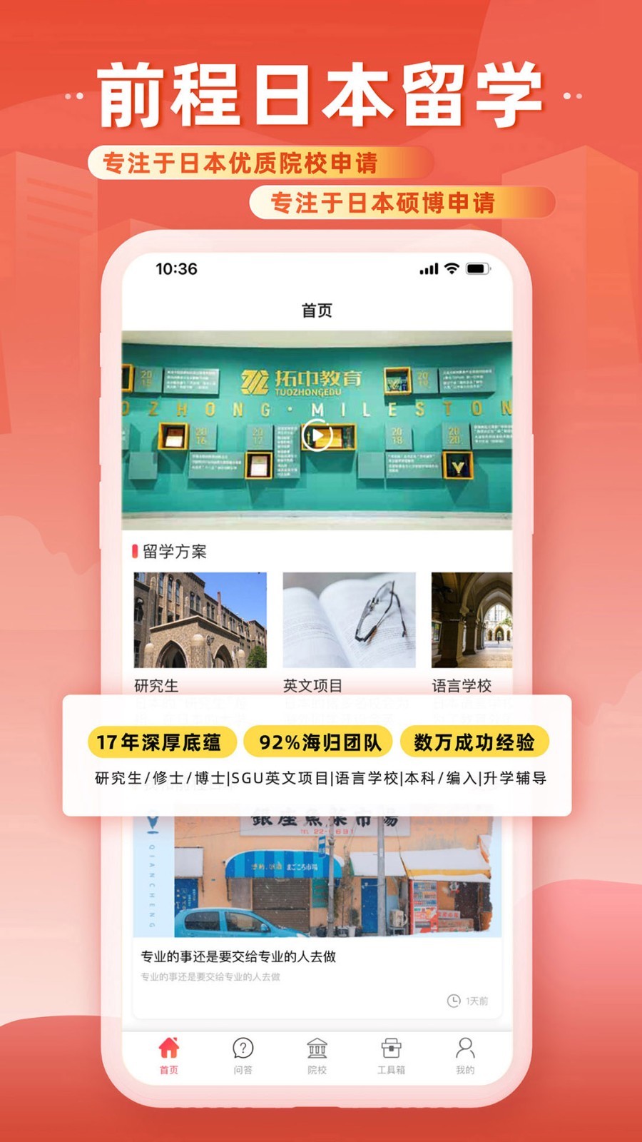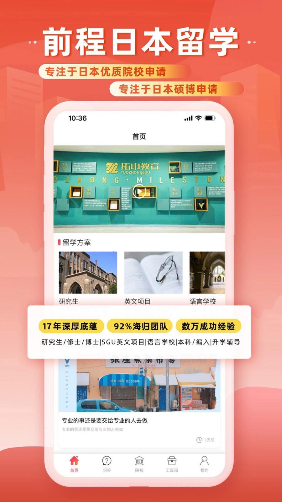 前程日本留学是一款由大连拓中教育科技股份有限公司专为广大出国留学的小伙伴们所打造的留学者指南app,该软件内有着非常全面的留学新闻资讯、海量名校信息、拓展品牌中介、特色留学社区等一应俱全,为广大留学生提供留学指导。软件还支持为用户提供口语培训,帮助用户可以适应留学生活学习场景的正常交流,专业大品牌值得信赖,有需要的小伙伴们快来下载试试吧!