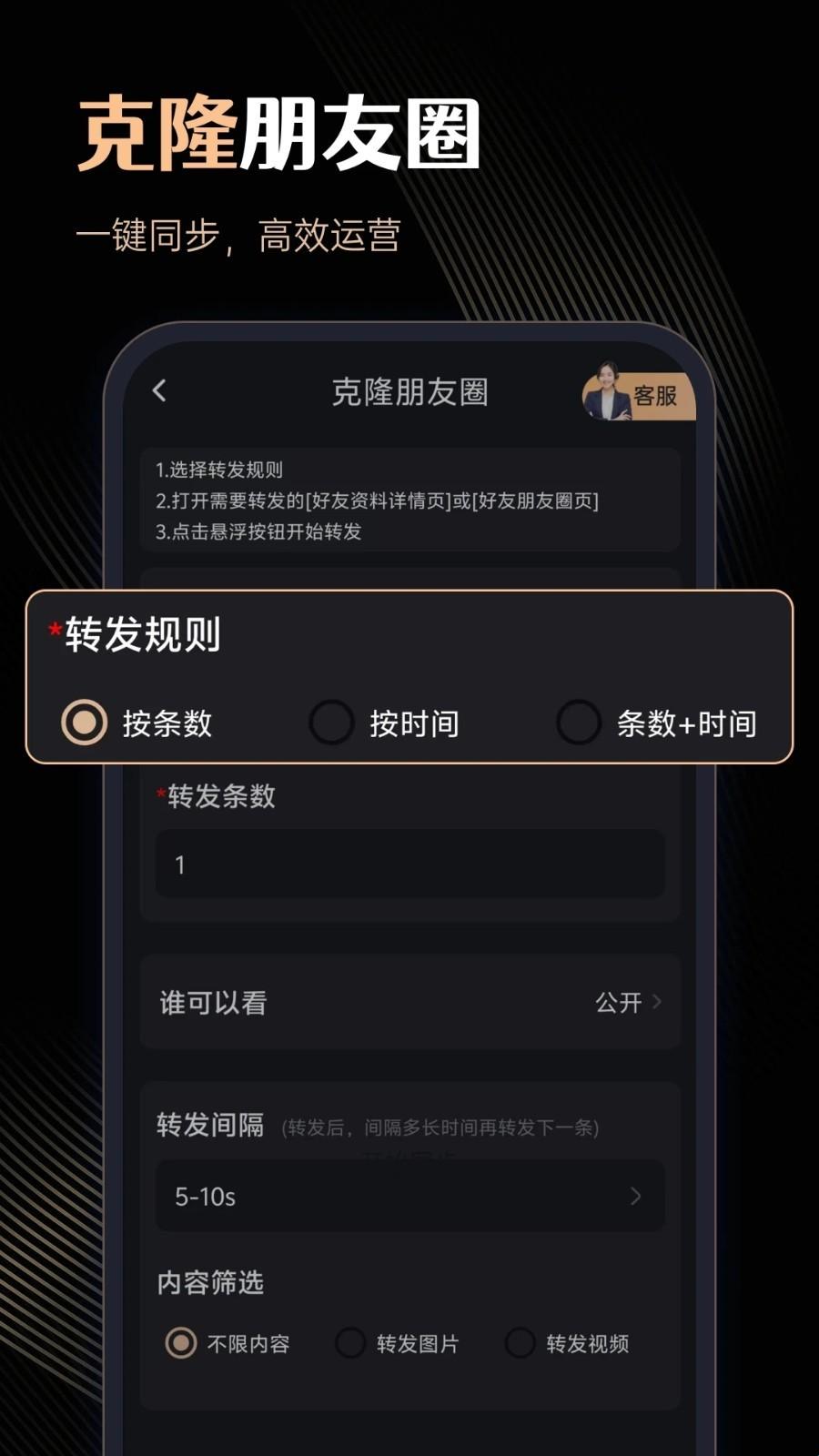 5、朋友圈转发:一键转发朋友圈内容,告别繁琐的复制粘贴操作,让您的朋友圈推广变得更加简便快捷。快速传播您的信息,让分享变得轻松无阻。
