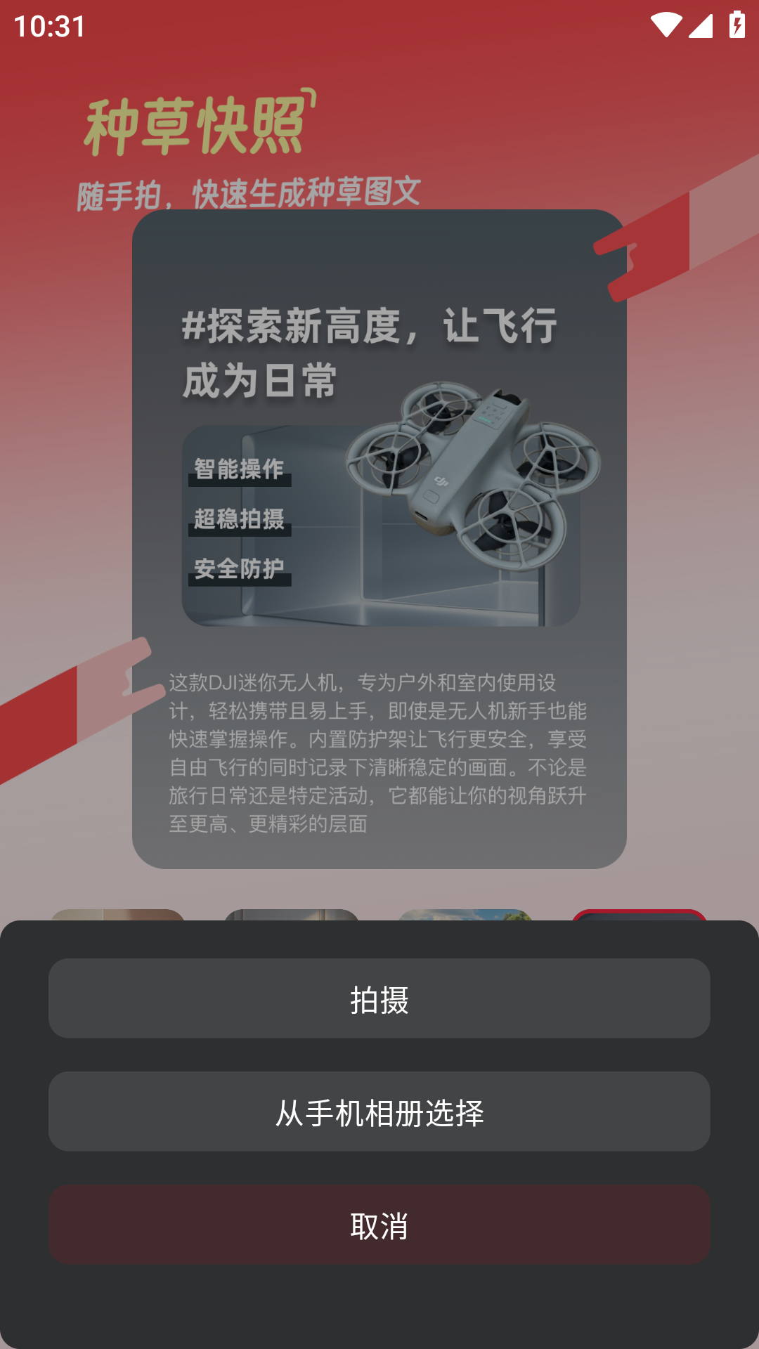 3、点击拍照或者从相册上传照片就可以生成种草创作了。