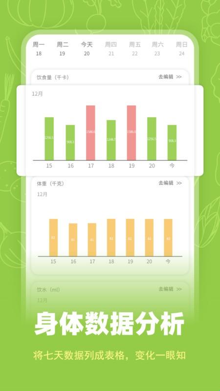 1、饮食记录,每天饮食的内容都记录下来,以便更好的查看饮食数据。