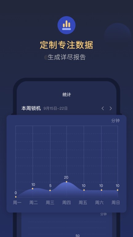 2、专属报告:在每次用户使用后本产品会为用户定制专属报告,自动生成图表,人性化分析本次锁机情况,帮助用户养成良好的生活习惯。