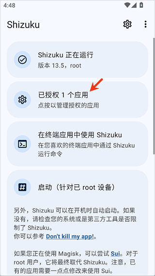 1、使用Shizuku进行授权,让更多高级功能的Xposed模块能够运行,Shizuku的激活可以参考本站Shizuku的下载页或其官网。