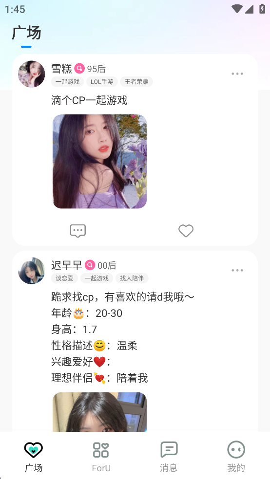 《ForU》是一款专为游戏玩家设计的社交+组队一站式平台,是你的专属游戏社交搭档,平台覆盖《王者荣耀》《和平精英》《金铲铲之战》等主流游戏,汇聚海量游戏大神与高颜值玩家,一键组队开黑、语音连麦、CPDD,让游戏不再孤单!