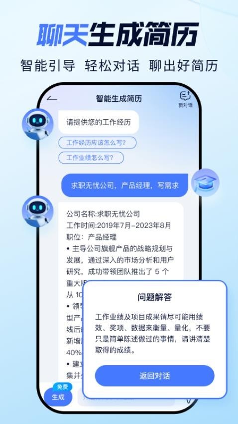 2、聊天对话:平台提供了线上的聊天对话,会智能引导用户轻松对话生成简历。