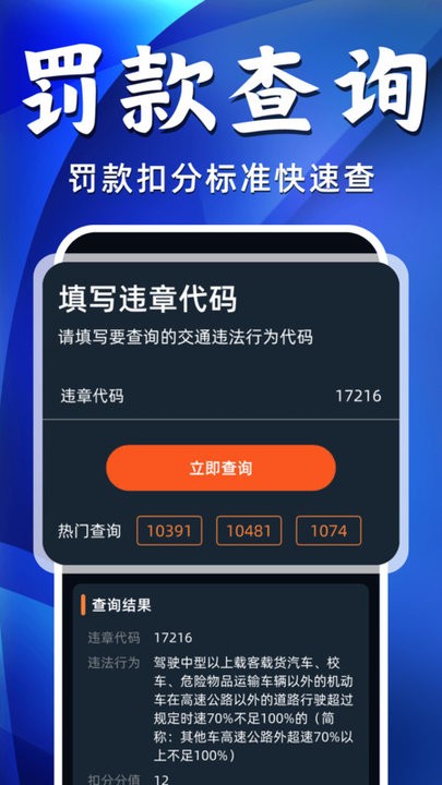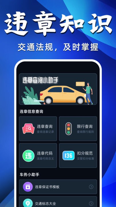 2、交通标志:APP内置交通法规解读功能,帮助用户了解交通法规的具体内容和要求,避免因不了解法规而产生违章行为。提供各类违章行为的处罚标准,让用户清楚知道每种违章行为可能面临的处罚结果。
