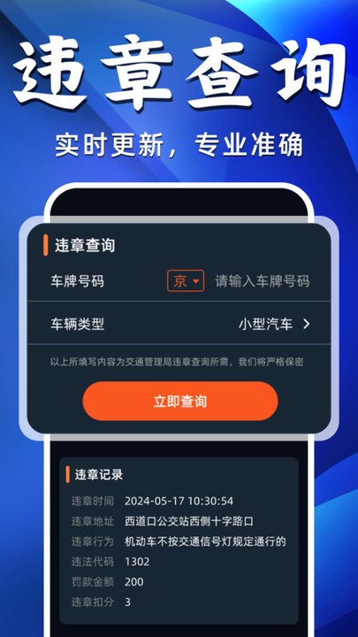 2、实时同步官方数据,覆盖全国的违章查询服务,输入车牌和发动机号就能查,还能看到违章地点、时间等详细信息。