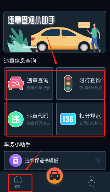 1、进入软件后,首页能看到违章查询、限行查询、违章代码查询和扣分规范这些功能,想查哪项直接点进去,一目了然很好找。
