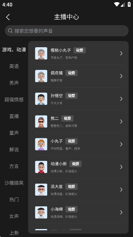 1、配音语音库:包含丰富的AI配音主播资源,覆盖不同年龄段、性别和风格,例如有适合纪录片的沉稳男声、适合广告的甜美女声、适合搞笑视频的俏皮童声,以及粤语、英语、日语等多语言配音选项,满足多样化的配音场景。