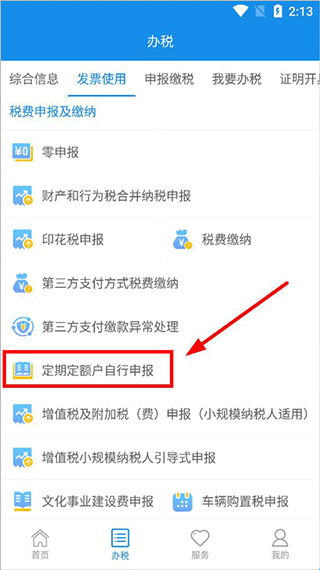 2、进入办税页面,有增值税纳税人等级、存款账户账号报告、发票使用等,下拉找到定期定额户自行申报功能
