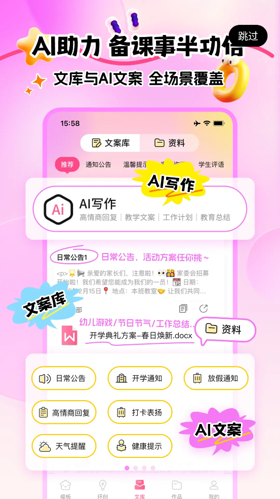 3、文库与AI文案覆盖全场景,从日常公告到教学总结,提供丰富文案及资料支持。