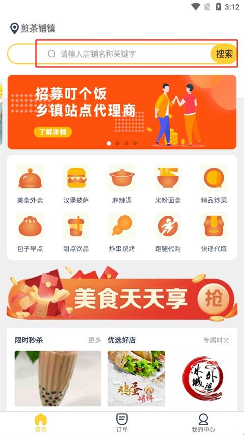 1、打开叮个饭软件,在搜索框中搜索想吃的东西。